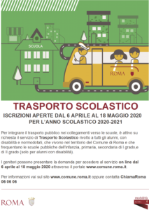 ISCRIZIONE_TRASPORTO XIV MINICIPIO il termine delle iscrizioni al servizio di trasporto scolastico per l’a.s. 2020-21 è stato differito al 29 maggio 2020